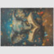 The background is a deep teal-blue, speckled with small, glittering particles that add depth and a sense of cosmic wonder.