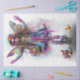 The young girl is holding a basket filled with decorated Easter eggs and small toys. There are also Easter eggs and a small bird in a basket on the ground near the person's feet. Another small bird is standing on the ground next to the person. The background is filled with a colourful, powdery effect, enhancing the festive and magical atmosphere of the image. This image captures the essence of a joyful and imaginative Easter celebration, showcasing creativity and vibrant colours that are often associated with the holiday.