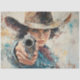 Painted photo woman sheriff, pointing gun bank robber, Western attire, wide-brimmed hat, long coat, rugged desert landscape, dramatic and intense, bold brushstrokes, vibrant colours