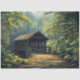 covered wooden bridge, lush green forest, red shingled roof, clear stream, sunlight filtering, dense canopy, dappled light, vibrant foliage, serene atmosphere, rustic charm, peaceful solitude, natural setting, scenic bridge, tranquil nature.
