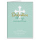 This dedication card for a little one is in a neutral green for either a boy or girl. Dotted rays flow out of the white cross with in a digital gold looking word that says Dedication. Send blessings to the little one on their Dedication Day.