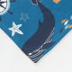 Colourful, fun, nautical theme fleece blanket with a deep ocean blue background and various nautical and ocean things such as octopus, whales, ship wheels, anchors, sailboats, crabs, banner flags, seahorses, sea shells, lighthouses and stars!