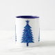 Mug in a classic silhouette of a Christmas tree in dark sapphire blue, patterned with satin textured stars in aqua and ice blue