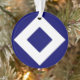 A deep blue diamond is surrounded by a thick white border in the centre of this bold, geometric pattern. The white diamond border is flanked by four dark blue triangles in the corners.
