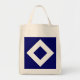 A deep blue diamond is surrounded by a thick white border in the centre of this bold, geometric pattern. The white diamond border is flanked by four dark blue triangles in the corners.