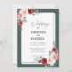 Celebrate your special day with this romantic and elegant wedding invitation featuring lush watercolor blush pink and deep red florals, accented by soft eucalyptus greenery, all set against a rich deep green background with a clean minimalist frame. Perfect for fall weddings, rustic garden ceremonies, elegant vineyard events, and evening celebrations.