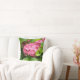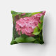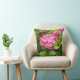 A beautiful setting featuring deep pink hydrangeas in full bloom nestled among their vibrant leaves and greenery. A pillow that will stand out in your home decor.