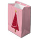 A simplified modern take on a classic Christmas tree motif, deep red quilted satin damask on a salmon pink background