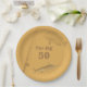 Masculine birthday party plates for the deep sea / saltwater fisherman turning 50, or any age - all text is easy to change. Customize the text in the centre of pale orange paper plates which are decorated with fish and a fishing pole / rod and reel.