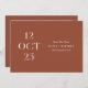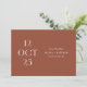 Announce your wedding date with warm seasonal style using this minimalist Save the Date card in a rich deep terracotta background (also known as rust clay). The bold editorial date layout adds a modern, design forward feel, while the back features space for a favourite photo for a personal touch. The warm earthy tone makes this design perfect for fall and autumn weddings, boho celebrations, vineyard events, or outdoor gatherings with natural textures and cozy colour palettes. Personalize the date, names, location, and photo to suit your style. Available as both a printed card and a digital download.