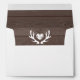 Deer antler wedding envelopes and wood grain liner. Rustic country chic design for wedding, bridal shower, engagement, anniversary etc. Faded distressed look vector art heart and antlers. Wild animal hunter / outdoor hunting theme. Brown barn wood grain panel background texture. Custom envelope colour on the outside.