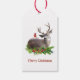 A red cardinal sits on the back of a white-tailed buck on these cheerful Christmas gift tags.