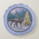 A whitetail buck and doe stand in a clearing surrounded by a forest of fir and pine trees, their branches heavy with snow. In the middle of the clearing is a Christmas tree decorated with warm holiday lights glowing through the snow to brighten the dark winter night. Realistic artwork created from an original oil painting by wildlife artist Crista S. Forest.