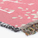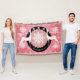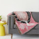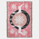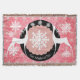 Beautiful Christmas holiday throw blanket features a background of pink with white snowflakes, a ring of solid black with a few white snowflakes, and a centre of pink with tiny white polka dots. Two white deer silhouettes adorn this pretty holiday throw and there's an area you can easily personalize with your family name.