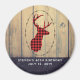 Birthday party save the date magnet with a rustic style. Designed with a deer head with antlers, made of red plaid. A fancy oval frame surrounds the image. An image of wood planks for the background gives it an outdoorsy country feel. The bottom border has a dark blue pattern with sprigs and leaves with your text written over top.