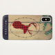 Casemate case with a rustic style. Designed with a deer head with antlers, made of red plaid. A fancy oval frame surrounds the image. An image of wood planks with green ivy leaves for the background give it an outdoorsy country feel. The bottom border has a dark blue pattern with sprigs and leaves with a personalized ame written over top.