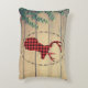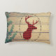 Accent pillow with a rustic style. Designed with a deer head with antlers, made of red plaid. A fancy oval frame surrounds the image. An image of wood planks for the background give it an outdoorsy country feel.