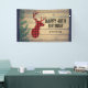 A party banner with a rustic style. Designed with a deer head with antlers, made of red plaid. An image of wood planks with green ivy leaves for the background gives it an outdoorsy country feel.