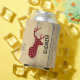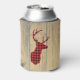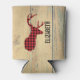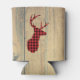 Personalized can cooler with a rustic style. Designed with a deer head with antlers, made of red plaid. An image of wood planks for the background gives it an outdoorsy country feel.