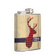 Personalized flask with a rustic style. Designed with a deer head with antlers, made of red plaid. . An image of wood planks for the background gives it an outdoorsy country feel.