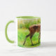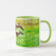 This nature mug features my original photograph of a mother White-tailed deer, called a doe, and her baby, called a fawn, walking through a meadow in Texas. I processed my photograph with a watercolor painterly style for an artsy flair. The handle and inside of the cup are in green to complement the artwork.
