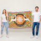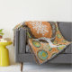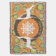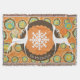 Beautiful Christmas holiday throw blanket features a background of vintage orange with colourful snowflake orbs, a ring of solid dark brown, and a centre of orange with tiny white polka dots and a big snowflake centre. Two white silhouette deer and pretty tree ornaments adorn this whimsical holiday throw and there's an area you can easily personalize with your family name.