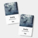 Name badge with a photo of a regal deer with antlers standing in a shadowy forest among sunlit trees. Snow falling all around.