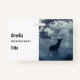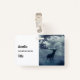 Name badge with a photo of a regal deer with antlers standing in a shadowy forest among sunlit trees. Snow falling all around.