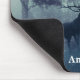 Mouse pad with a photo of a regal deer with antlers standing in a shadowy forest among sunlit trees. Snow falling all around.