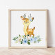 Deer, Woodland Animals, Boho, Blue Flowers Poster
