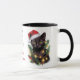 On this mug, a bewildered looking black cat is tangled in a string of Christmas tree lights. The cat wears a red and white Santa Claus hat. The image is printed twice on the mug, with text fields between the images. Currently the text says "Dear Santa, Define NAUGHTY" and "Merry Christmas". You may easily change the text to anything else you'd like, and personalize it, also. Cute for kids and adults, especially if there's a mischievous cat in the house!