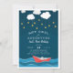 Une charmante invitation à la fête d'anniversaires de enfants à thème nautique comprend un arrière - plan du ciel nocturne avec étoiles et nuages, et un bateau en papier rouge naviguant sur la mer. "Set sail for adventure" apparaît au-dessus de vos détails de fête en lettres blanches.