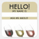 Hello and Ask Me About text sera un bon début de conversation pour votre événement vinicole. Trois verres de conception de vin sur autocollant pour la soirée de dégustation de vin ou les étiquettes de nom d'événement. Le graphique montre un vin rouge, du vin blanc et du vin léger ou "rose". Modifiez les lignes de texte si vous le souhaitez. Les gens peuvent écrire dans leur nom et quelque chose dont ils voudraient parler.