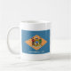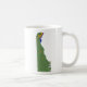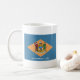 This mug design features the Delawarean flag on one side and a map of Delaware on the other.