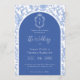 Delft blue floral wedding invitation card, designed in a refined blend of chinoiserie and French toile de Jouy style. The soft botanical illustrations frame an arched layout featuring an elegant wedding crest monogram, perfect for couples who love vintage, historic, and European-inspired aesthetics. Classic script typography pairs beautifully with the ceramic-blue palette, making this design an effortless nod to the tradition of “something blue.” Fully customizable with your names, date, and location, it’s an exquisite choice for any romantic or sophisticated wedding theme.