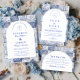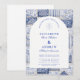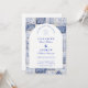 A timeless blue and white design inspired by classic Delft porcelain and French toile patterns. The patchwork tile border combines delicate florals, stripes, and ornamental motifs that evoke vintage European ceramics. A soft arched panel in the centre keeps the layout refined and elegant while allowing the details of the porcelain-inspired pattern to frame the celebration beautifully. Perfect for couples planning a sophisticated blue and white wedding with traditional European charm.