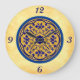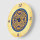 A decorative wall clock with a blue vintage design with blue numbers on a faux parchment background.. Click Customize It to add your name or message, change background colours, even save your design for later.