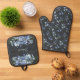 Elegant Oven Mitt & Pot Holder Set. The oven mitt features a pattern of delicate blue wildflowers, while the pot holder showcases decorative bouquets of blue wildflowers with a customizable text area in the centre where you can add your name.Set against a very dark blue-grey background, this set combines both beauty and functionality, making it a stylish addition to your kitchen decor.