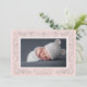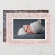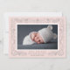 An intricate botanical border in pale blush pink and elegant grey frames your favourite horizontal newborn photo in this beautiful birth announcement for brand new baby girls. Personalize with your new arrival's name, birth stats and your names beneath the photo. Add a second photo to the back if desired, or remove the sample photo to reveal a pattern of blush and white stripes.