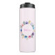 Delightful watercolor floral wreath design featuring delicate blooms in pink, purple, and blue, accented with metallic gold leaves on a soft pink background. This feminine and romantic design is lovely for fems of any age. Personalize with a name.