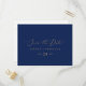 Cette délicate carte postale or et marine, à l'exception de la date, est parfaite pour un mariage moderne. Le design minimaliste romantique présente une belle et élégante typographie de champagne jaune doré sur un arrière - plan bleu marine au look épuré et simple.