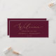 This delicate gold burgundy hanging seating chart welcome header is perfect for a modern wedding. The romantic minimalist design features lovely and elegant champagne golden yellow typography on a burgundy red background with a clean and simple look. The card prints on the front and back (double-sided). Please check the collection for the coordinating table number seating chart cards.