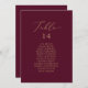 These delicate gold and burgundy table number seating chart cards are perfect for a modern wedding. The romantic minimalist design features lovely and elegant champagne golden yellow typography on a burgundy red background with a clean and simple look. The card prints on the front and back (double-sided).