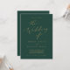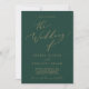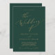 This delicate gold calligraphy green wedding invitation is perfect for a modern wedding. The romantic minimalist design features lovely and elegant champagne golden yellow typography on an emerald green background with a clean and simple look.