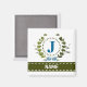 A delicate ivy wreath with a blue striped bow is layered over a fresh white background. Wedding appropriate design features the monogram "J" in blue. Magnet can be personalized with any name over the green ribbon banner. Design tip: For the font shown here, use all caps for the name.