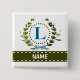 A delicate ivy wreath with a blue striped bow is layered over a fresh white background. Wedding appropriate design features the monogram "L" in blue. Button can be personalized with any name over the green ribbon banner. Design tip: For the font shown here, use all caps for the name.
