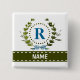 A delicate ivy wreath with a blue striped bow is layered over a fresh white background. Wedding appropriate design features the monogram "R" in blue. Button can be personalized with any name over the green ribbon banner. Design tip: For the font shown here, use all caps for the name.