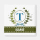 A delicate ivy wreath with a blue striped bow is layered over a fresh white background. Wedding appropriate design features the monogram "T" in blue. Magnet can be personalized with any name over the green ribbon banner. Design tip: For the font shown here, use all caps for the name.