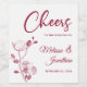Elegant customizable wine labels for your wedding reception, featuring beautiful and delicate crimson red orchids line drawing on one side, over a classic white background, and the wording "Cheers to the wedding of" in red fonts. Easily edit the template fields to add the bride and groom names in a classy dark red script, and your wedding date in a modern all-caps font.