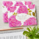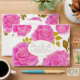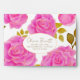 This design features large, radiant pink roses with delicate golden highlights, arranged gracefully over a pure white background. The contrast between the bright blossoms and the crisp white space creates a clean, elegant, and uplifting feel. Golden-green leaves add warmth and luxury to the floral composition, while the central oval frame outlined in gold provides a refined space for personalized text.
